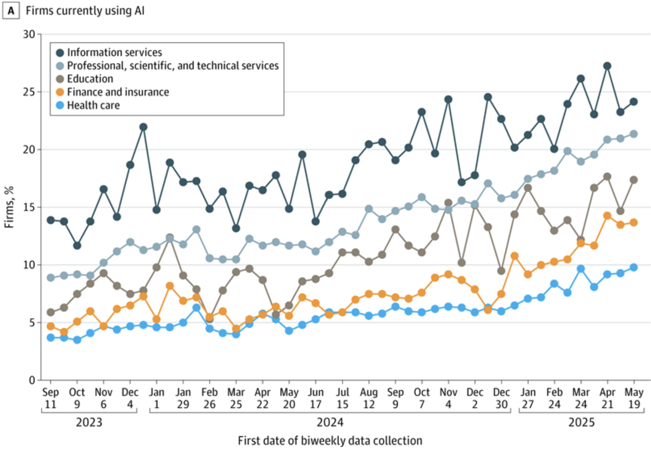 A recent JAMA report calculated biweekly trends in the percentage of firms responding “yes” to using AI in healthcare, based on the U.S. Census Bureau’s Business Trends and Outlook Survey (BTOS), as a proxy for AI adoption in the healthcare sector. Between September 2023 and May 2025, the mean adoption rate was 5.9% and increased steadily over time, reaching 8.3% in 2025. Plotting this adoption trend alongside those of other industries provides valuable context for discussion (see graph below).